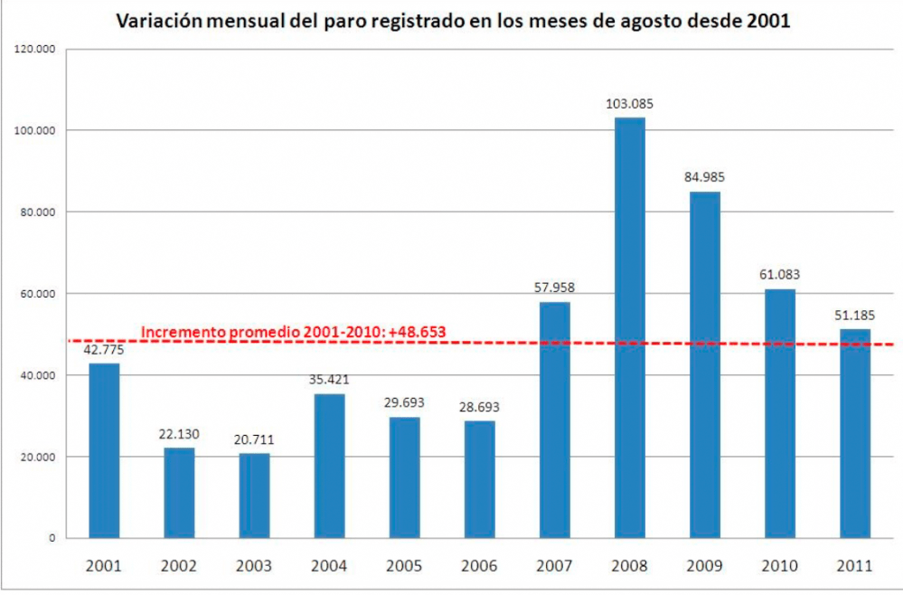 A ver si os lo explico. El paro registrado durante el pasado mes de agosto aumentó en España en 51.185 personas, lo que supone un comportamiento «peor» que el promedio de incrementos de los agostos de la última década –que se cifra en +48.653 parados de media.
