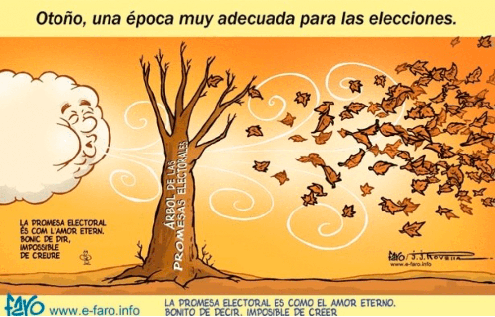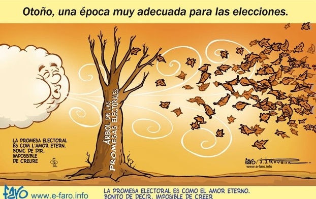 La «feria de las promesas electorales» es un escándalo. Te dicen con el mayor descaro que se preocuparán de los pobres, dándoles trabajo, que combatirán la inflación como fieras, que no habrá nuevos impuestos, que se crearán escuelas y hospitales, que extirpará de raíz la corrupción oficial, que habrá nuevos estímulos para los emprendedores, etc, y un sin fin de MENTIRAS que luego, con su llegada al poder no se cumplen. ¿Os suena? ¡ Cuántas promesas y mentiras hechas a la ligera! , sin el menor escrúpulo y con el solo propósito de «ganarse los votos de los crédulos» para despues «embaucarlos miserablemente».