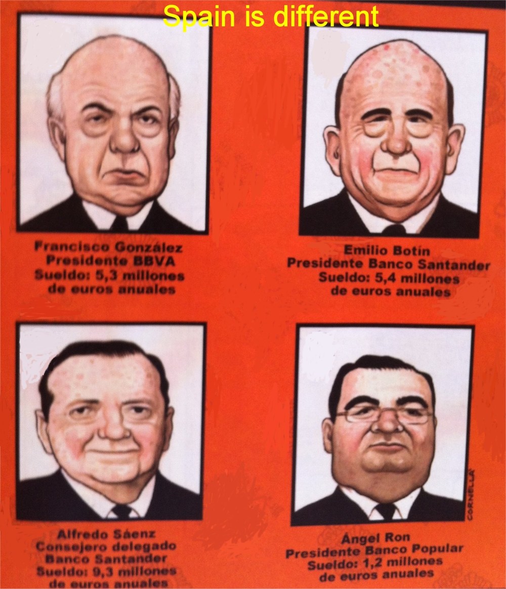 Ricos y pobres siempre ha habido en todo el mundo, pero los «ricos españoles» -como decia Don Manuel Fraga «son diferentes» y no estan por la labor de «ayudar al Pais». Parte de los 2.148 millones de euros en que los «ricos-ricos españoles» aumentaron su patrimonio en 2011 están «en manos de banqueros» y estos en el 2012 seguirán manteniendo sus ganancias siguiendo el único plan «que saben hacer» que no es otro que el de continuar con su actual política que no es otra cosa que : «medio millón de nuevas ejecuciones hipotecarias«. ¿Que no es suficiente con «echar a la calle a los pobres»? No pasa nada porque los bancos españoles están cubiertos ante «posibles caídas» del precio del suelo hasta en un 87 %. Es decir que podría vender estos activos con un descuento similar «sin dar pérdidas», según datos del Banco de España.