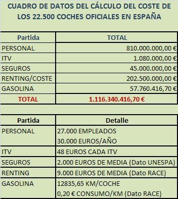 También le comento que según datos de la Intervención General del Estado del pasado mes de abril, España dispone de más de 22.500 coches oficiales. De ellos 864 pertenecen a la Administración Central, 11.000 en ayuntamientos, 9200 en Comunidades Autónomas, 1200 en Diputaciones y unos 300 en organismos supramunicipales como mancomunidades. Estos son sus gastos