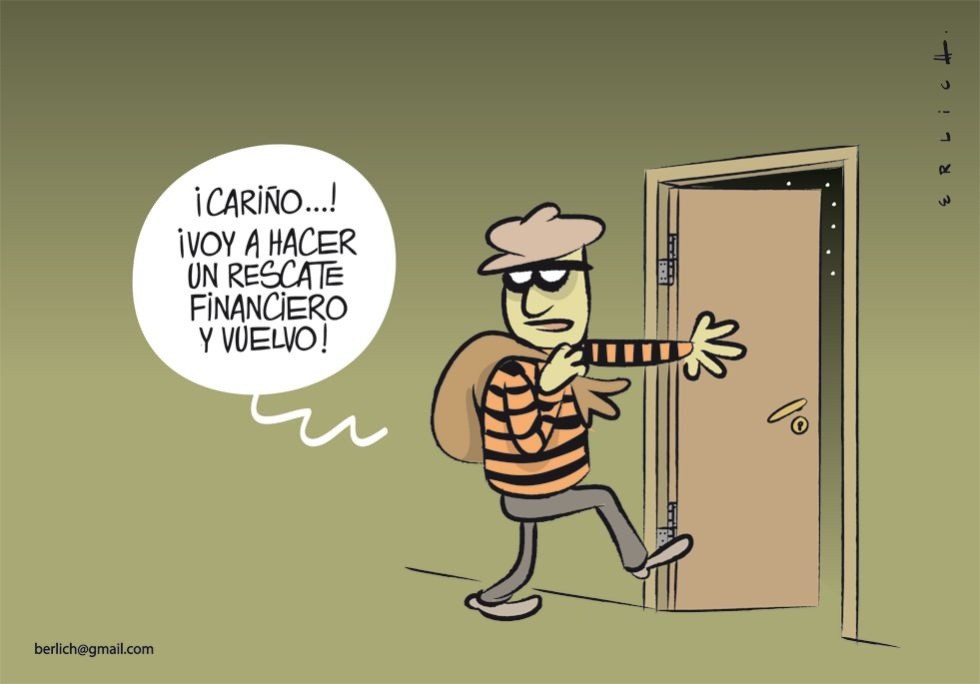 El humorista Erlich define muy bien hoy en su viñeta de «El País» lo que es un «rescate financiero» en los tiempos actuales. Así cantaba El Koala en España su «tema del Verano» del año 2006 aludiendo al «corral» que es ese recinto para «esha la gallina, el minino, las perdice, el pajarillo, la guarrilla, el guarrillo y la potra con su potrillo» y todo BIEN CERRADO para que «no se escapen»