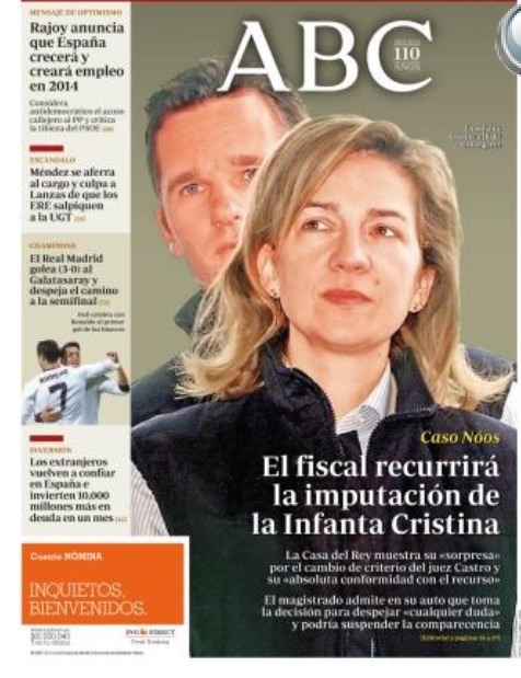 1.- ABC de hoy con el titular que dice: «El Fiscal recurrirá la imputación de la Infanta Cristina» (como si «El Fiscal» fuese el paradigma de la justicia y la equidad)