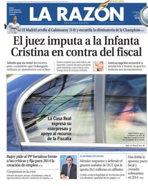 2.- Diario La Razón que afirma en su portada: «El juez imputa a la Infanta Cristina en contra del Fiscal«.