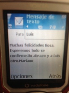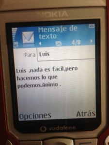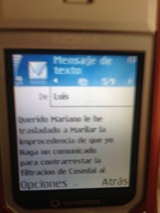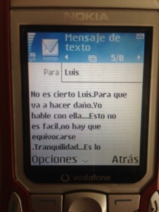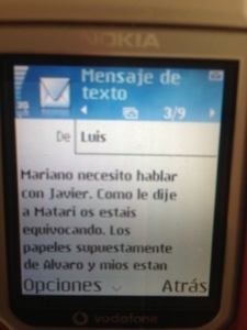 En ese aparato me he puesto en el papel del señor Rajoy (como presunto poseedor de ese móvil antiguo) y he creado en el mismo a un usuario llamado «Luis» al que he enlazado al número de mi actual telefono (un moderno smartphone iPhone 5), luego he reproducido todas la secuencia de los mensajes que publica hoy el diario «El Mundo» enviándomelos desde el Nokia y contestándolos desde el iPhone Así he podido reproducir la totalidad de los mensajes que publica hoy el Diario «El Mundo». Estos son los resultados: