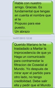 Estas capturas de pantalla muestran los mensajes enviados entre nuestro jefe del Ejecutivo, con «su tesorero» en el PP y con la esposa de este último, doña Rosalía Iglesias. Según el diario, esta correspondencia telefónica sale a la luz por el propio interés de Bárcenas, que reacciona así después de que el portavoz ‘popular’ en el Congreso, Alfonso Alonso, le llamase «delincuente«.