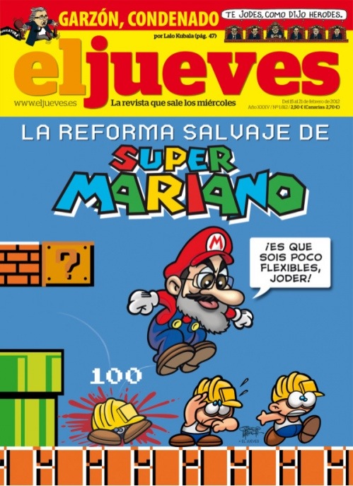 La ultima portada de la revista humorística «El Jueves» nos lo retrata como un «Súper Mario Bros» que pisotea a los trabajadores .La comparación es muy acertada, porque el juego político de don Mariano se parece mucho al de aquel personaje de Nintendo diseñado por Shigeru Miyamoto.