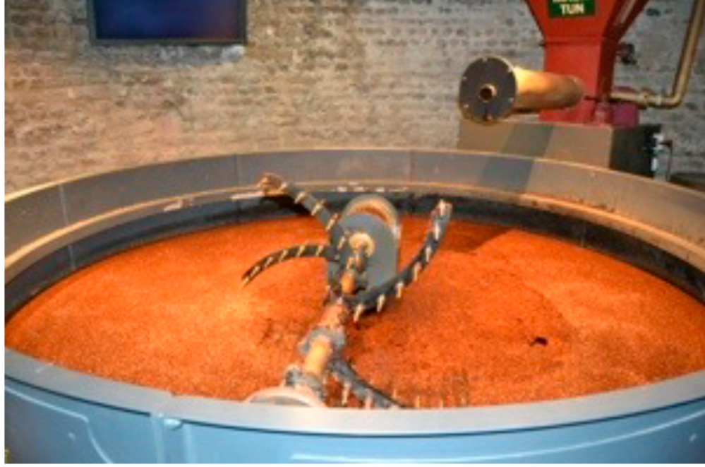 Seguidamente la molienda pasaba a mezclarse con agua caliente a una temperatura de 63ºC en un recipiente enorme denominado «cuba de maceración». La mezcla se agitaba con unos rastrillos de grandes dimensiones y así los almidones de los granos se convertían en azúcares fermentables. Tras cuatro horas de maceración, los rastrillos se detenían y se obtenía un líquido dulce denominado «wort» que se enviaba al siguiente proceso