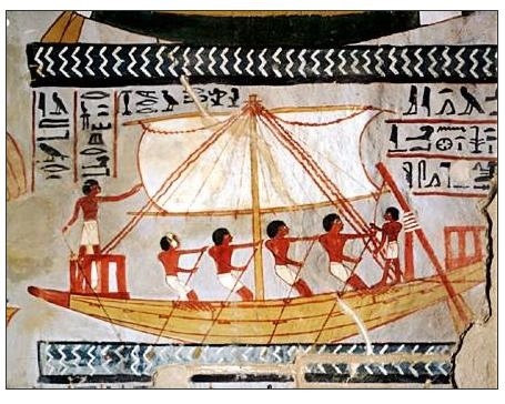 El viento en Egipto imprime una forma a su desierto y allí existe un aire fuerte que sopla siempre en la misma dirección. Este viento era una constante en la vida de los antiguos egipcios. El meteorólogo de la NASA Edward Teets analizó los «patrones eólicos» de aquella tierra y descubrió que los mismos se repetían regularmente todos los años; por eso los vientos, sobretodo los del noroeste y nordeste, se convirtieron en una importante herramienta para el pueblo egipcio. Sus marinos se sirvieron de la fuerza del viento para navegar por el río Nilo y la vela fue inventada en una fecha anterior al 3500 a.C. Se piensa que el pueblo egipcio fue el primero del mundo que consiguió «dominar el viento para propulsar sus barcos«. Mirando las velas de un barco ya se puede ver el gran empuje que produce ya que el viento, literalmente «arrastra la nave por el agua».