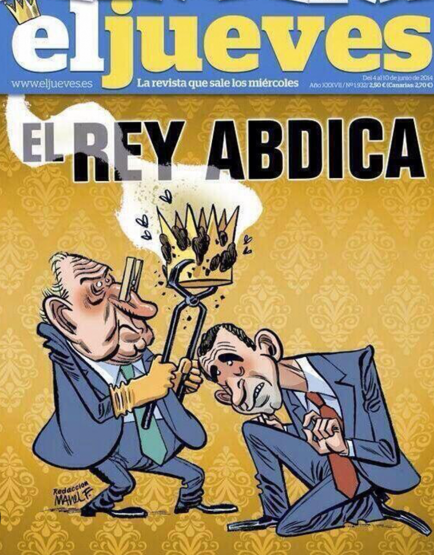 La abdicación del rey Juan Carlos I ha tenido críticas jocosas. Para mi la más incisiva y mordaz fue aquella que hizo la revista satírica «El Jueves» en su edición del pasado 4 de Junio de 2014 que le costó tener que retirar 60.000 ejemplares de los kioscos