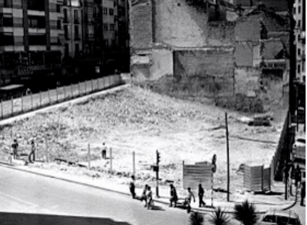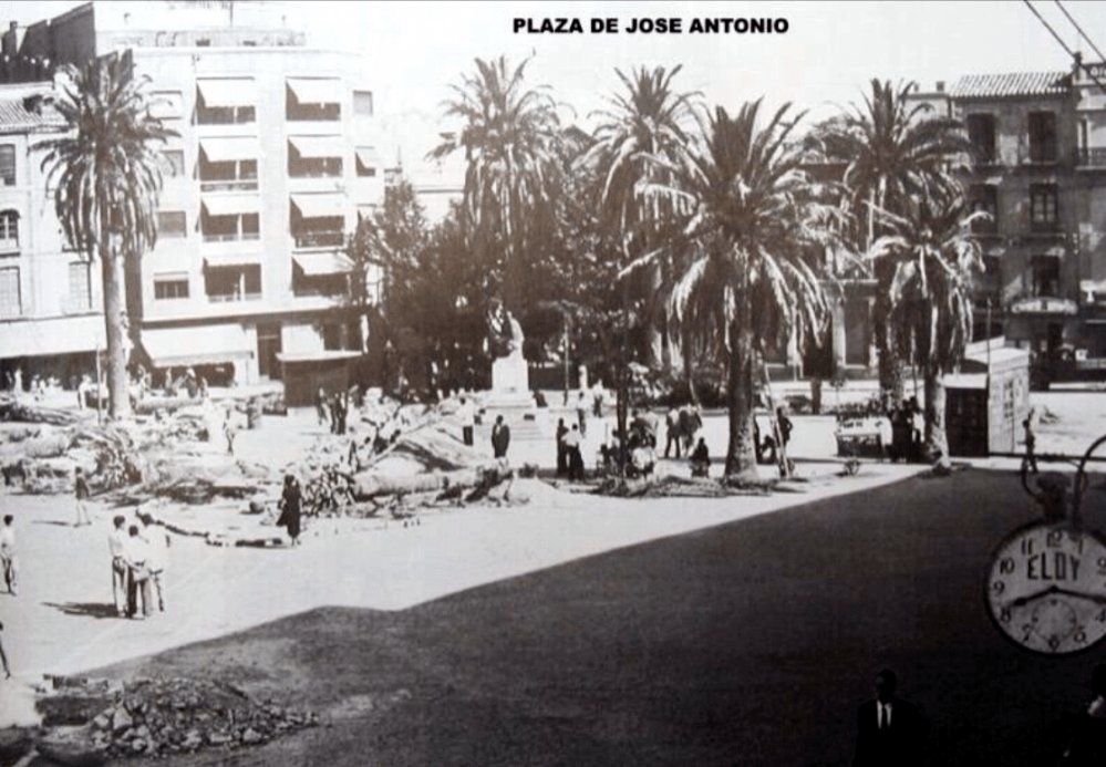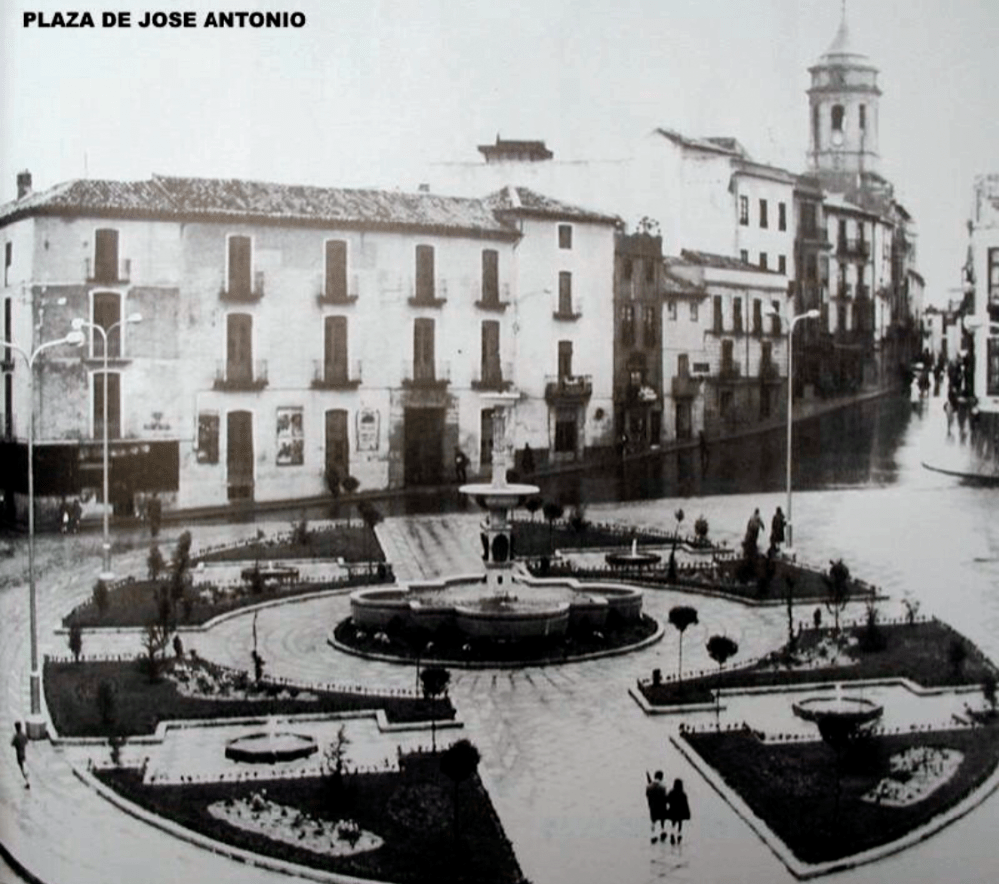 La nueva Plaza resultante se rebautizó como «Plaza de José Antonio«, pero ya nunca sería la misma. Se llevaron la estatua de don Bernabé Soriano al parque de La Alameda (hoy restituida a la plaza) y quedo con el horrible aspecto que certifica la siguiente foto, tomada en el mes de Abril de 1,958 en la que puede verse con su nuevo aspecto, desafortunado y pretencioso, que se mantuvo durante un montón de años