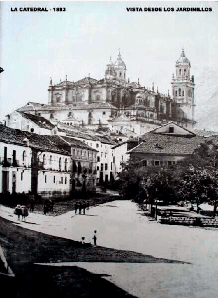 A principios del siglo XIX trabajaba en Jaén un fotógrafo llamado Genaro Giménez de la Linde (1827-1885) que tenía su estudio en el callejón del Circo Gallístico, 2 a las espaldas del palacio episcopal de Jaén; este artista vendía sus placas en aquellos tiempos a dos reales en formato de tarjeta de visita, a cuatro reales en formato de media placa (6 x 9 cms.) y a seis reales en formato de placa entera (12 x 18 cms). La imagen siguiente es de este gran artista y data de 1883; en ella podemos ver a la izquierda el antiguo «Cuartel de «San Rafael» y la llamada «Alhóndiga» que era un almacén dedicado al comercio de grano; en los terrenos que ocupaban estos dos edificios se construiría posteriormente el «teatro Cervantes»