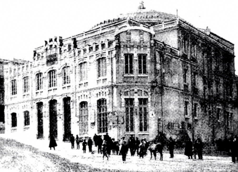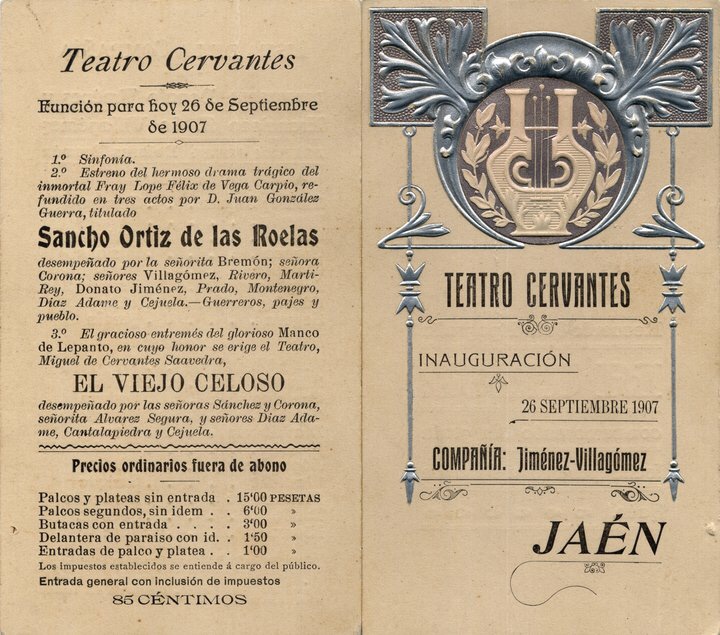 Y aquel teatro «Cervantes» se gestó precisamente gracias a un incidente ocurrido en el año 1904 en Jaén en aquella plaza, en su feria popular de Santa María de Agosto, porque se produjo un fatídico incendio en una caseta de baile, teatro y ópera, construida con madera y lona, allí situada y aquello fue el detonante para que se considerase que Jaén necesitaba un «teatro en condiciones». Para su promoción se constituyó la «Sociedad Anónima Constructora de 1905«, que con un capital de 25.000 pesetas encargó la obra por concurso público al arquitecto don Manuel Rivera Vera; las mismas comenzaron en 1906 sobre los solares de «La Alhóndiga» y el «Cuartel de San Rafael«, demolidos un año antes. La edificación fue muy rápida ya que la inauguración se hizo el 26 de septiembre de 1907. En la imagen que da título a esta entrada podemos ver a aquel teatro «Cervantes» recién terminado, cuyo aforo se llenó masivamente el día de la inauguración con la representación de las piezas «Sancho Ortiz de las Roelas» de Lope de Vega, y «El Viejo Celoso«, de Miguel de Cervantes, a cargo de la compañía Jiménez-Villagómez. Desde aquel día, el teatro «Cervantes» se convirtió en el protagonista principal de la vida social, literaria, religiosa y política de Jaén.