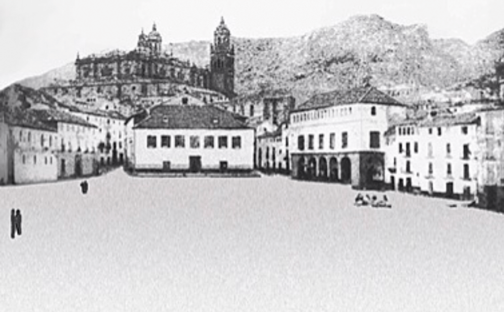 La historia del «Teatro Cervantes» va unida también a la de otro centro neurálgico de Jaén llamado antiguamente la «Plaza del Mercado» que era un gran espacio donde venían celebrándose todos los eventos festivos de Jaen, incluidas las corridas de toros. En esta antigua foto puede verse como era aquella plaza .