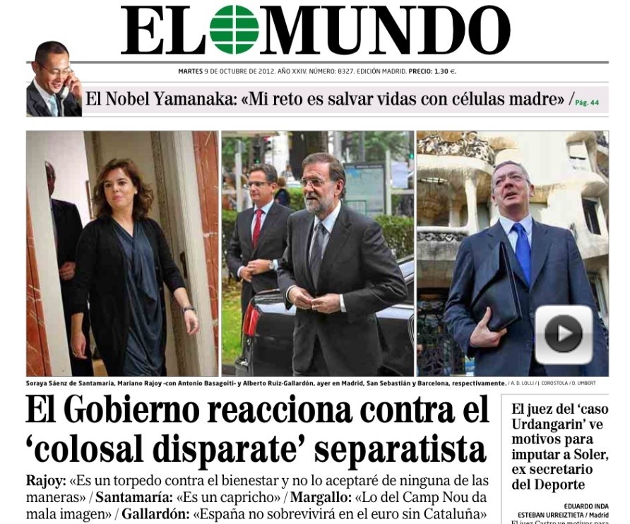 Empecemos por aquella portada de «El Mundo» del 9-10-2012 con su espectacular titular de : «El Gobierno reacciona contra el ‘colosal disparate’ separatista«. Y sí. Claro que hubo una «reacción espectacular«, pero no fue la de detener al señor Mas por su «desafío independentista» ni la de mandarle a Barcelona «dos banderas de la Legión» para tomar su Parlament; tampoco se habló de declarar «el estado de excepción» en Cataluña ni de aplicar a esta Autonomía el Art. 155 de nuestra Constitución. Nada de eso, la «espectacular reacción» de nuestro gobierno en aquel entonces fueron estas declaraciones de nuestro Presidente y de su «mano derecha»