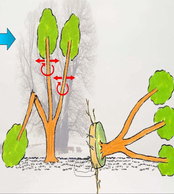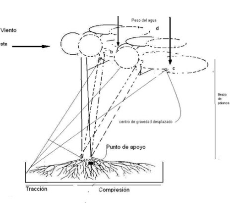 El momento de torsión con ese eje es el producto de la magnitud de las fuerzas actuantes por su ese brazo de palanca y el centro de gravedad del árbol será el punto a través del cual actuarán las fuerzas combinadas de viento y agua. Al final el árbol termina cayendo por «fallo radicular»