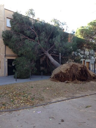 Otra de las debilidades de un árbol de ciudad es su sistema radicular. Sus raíces encuentran grandes dificultades para expandirse por el suelo ya que tienen que competir con cañerías, tuberías, cables, y todo tipo de infraestructuras subterráneas que impide su completo desarrollo para cumplir con la misión de anclar el árbol al suelo. El mejor destino lo tienen los árboles situados en parques urbanos pero allí también sus raíces se debilitan porque compiten con plantas de jardin que necesitan mucho riego, generando una humedad que favorece la descomposición radicular por agresiones de tipo fúngico. En definitiva: las raíces de los árboles urbanos tienen muy baja resistencia mecánica y eso disminuye su resistencia al empuje del viento y de la lluvia. Observemos la imagen siguiente que nuestra el peor escenario que puede darse para la caída de un árbol de ciudad por ese efecto combinado.