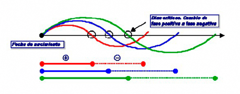 Explicaremos ahora someramente que es lo que dice la teoría de los biorritmos. Según la misma, en la fase positiva de sus ciclos, nuestra energía y capacidades son altas; luego de alcanzar un máximo, cada ciclo desciende gradualmente, cruzando el punto cero, y entrando en una fase negativa. En esta fase se reducen nuestras energías y capacidades, y cuando alcanzan un mínimo, vuelven a ascender hasta completar el ciclo. Por tanto cada ciclo del biorritmo se compone de dos semiciclos, uno positivo y otro negativo, ambos de la misma duración.