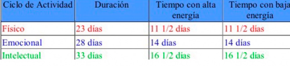 El ciclo físico afecta al cuerpo, e influye en la coordinación, la fuerza y la resistencia. En los 11 días y medio de su fase positiva aumenta nuestra fuerza y capacidad y en los 11 días y medio de su fase nos faltará energía .El ciclo emocional afecta a la sensibilidad y a las emociones y en los 14 días de su fase positiva estaremos más creativos e intuitivos, mientras que en su fase negativa de 14 días estaremos más sensibles, y decaídos. Finalmente, el ciclo Intelectual influye en nuestra memoria y capacidad de razonar y en su fase positiva de 16 días y medio aumentará nuestra capacidad para los estudios y todo lo que requiera atención y concentración, mientras que en su fase negativa de otros 16 días y medio nos sentiremos embotados mentalmente.