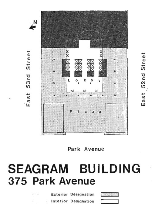 El «Seagram Building» surgió en el centro de Nueva York y en su construcción no siguió la línea de los demás edificios que lo rodeaban sino que dejó vacío casi la mitad del terreno de que disponía. dejando libre una amplia plaza de granito rosa de Vermont, que está bordeada a ambos lados por laminas de agua y plataformas de mármol antiguo verde.