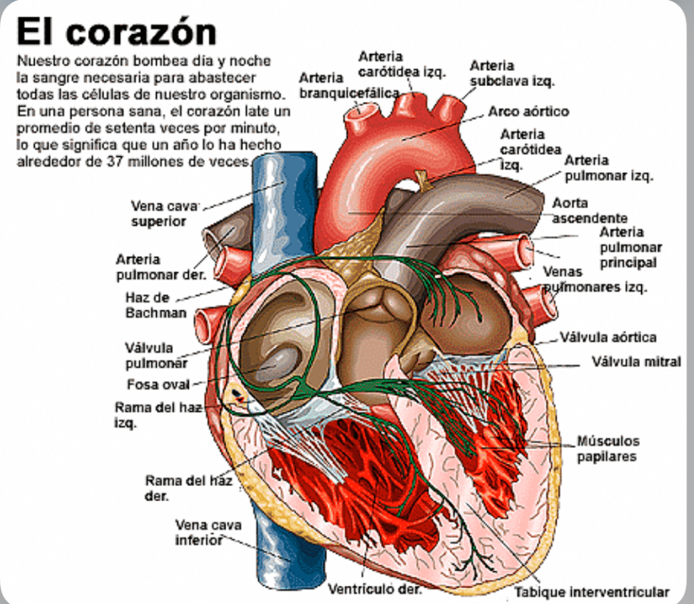 El corazón es un músculo hueco que con solo 12,5 centímetros de longitud y un peso aproximado de 450 gramos es capaz de mover la sangre por nuestro cuerpo. Tiene cuatro cavidades: dos superiores, llamadas aurículas, y dos inferiores, llamados ventrículos y para moverla utiliza cuatro válvulas que controlan la entrada y salida de este fluido llamadas : tricúspide, pulmonar, mitral y aórtica.