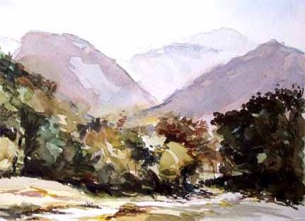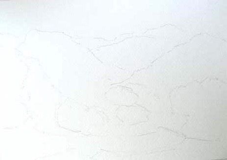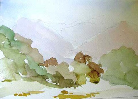 3.-Segundo manchado Dejando secar la acuarela diez o quince minutos efectuamos un segundo manchado, desde atrás hacia adelante en el que iremos definiendo las montañas y el cielo.