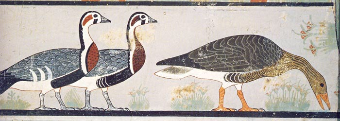 La técnica de la acuarela es muy antigua y los primeros trabajos con sistemas similares en los que se utilizaba agua mezclada con pintura datan del antiguo Egipto. En la Dinastía IV entre el 2613 y el 2498 a.C. en la Mastaba de Nefermaat y Atet en Meidum se hizo la siguiente pintura de 172 x 27 cm. en estuco pintado. Son las famosas «ocas de Meidum» de la época del faraón Snofru que representa en la capilla de Atet a estas aves y que fueron realizadas con una técnica pictórica similar al fresco con un fondo de tono azulado y una policromía que parece poner las bases de lo que vendría después.