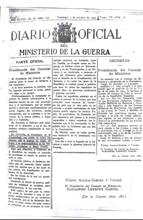 En 1873 bajo la I República, se proclamó un  «Estado Catalá» pero aquello se acabó cuando el presidente de la I República Española, Estanislao Figueras prometió la disolución del ejército español en Cataluña y envió a tres ministros a Barcelona para negociar consiguiendo que  Esquerra Republicana renunciara a su «Estado propio» . Tras la aprobación en 1932 de un Estatuto de Autonomía de Cataluña, en 1934, con Niceto Alcalá-Zamora y Torres de presidente de la República y Alejandro Larroux,de presidente de gobierno  se proclama de nuevo el «Estado Catalán» por el entonces presidente de la Generalitat, Lluis Companys, acusando al nuevo gobierno español de «monarquizante» y «fascista» con estas palabras : «Cataluña enarbola su bandera,y llama a todos a la obediencia absoluta al Gobierno de la Generalitat», La respuesta del presidente Lerroux fue la de declarar el estado de guerra.