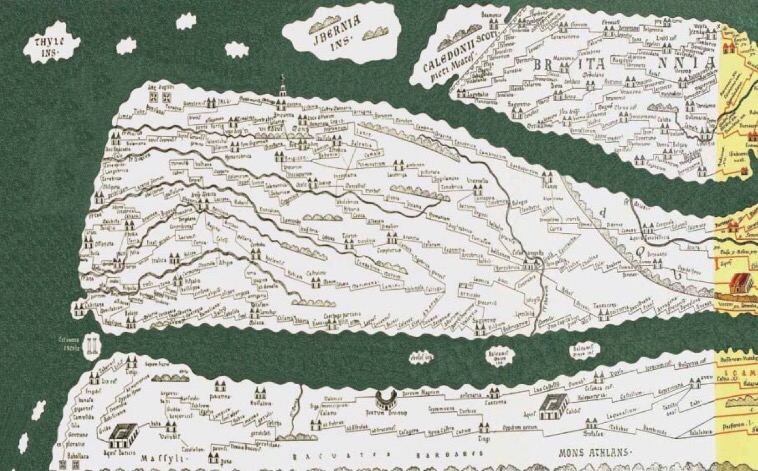 Luego, en el siglo XIII apareció otro gran pergamino compuesto por doce segmentos.- tal vez copia de otro más antiguo de los siglos III o IV llamado Tabula Peutingeriana (también conocida como Codex Vindobonensis 324), actualmente depositada en la Biblioteca Real de Viena, que es una carta vial, inspirada en datos de la antigüedad clásica romana. Se trata de un itinerarium pictum romano y está inspirada en datos, lugares y paisajes propios de la antigüedad clásica romana. Para hacer un mapa fácilmente manejable el dibujante comprimió las dimensiones Norte-Sur del Imperio y ensanchó las Este-Oeste, deformando las proporciones naturales. La primera parte desapareció, pero fue reconstruida por Conradus Miller a comienzos del siglo XX.