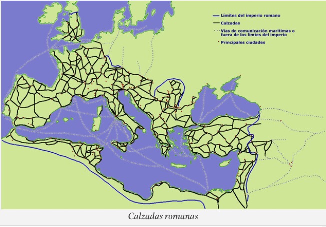 Estas calzadas, unidas a una infraestructura de rutas marítimas, discurrían por el Mediterráneo y bajo el mando de los emperadores de los siglos I y II llegaron a su máxima extensión, uniendo entre sí Europa, Asia y África, desde el valle de Adriano, en el extremo norte de Britania, hasta el Eúfrates y el desierto del Sahara.