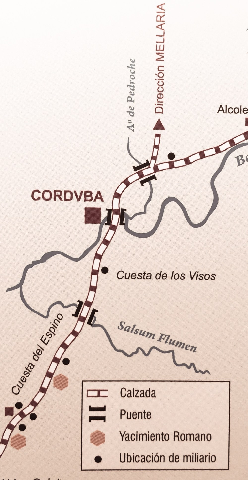 La figura siguiente representa un esquema de la Vía Augusta a su paso por Córdoba con las ubicaciones de sus miliarios. Era una vía que disponía de una infraestructura de apoyo a los viajeros con hospederías para alquiler de caballos, carruajes y lugares de descanso que solían estar separados cada 20 o 25 millas romanas (aproximadamente 35 Kms). En estas hospederías, también se ubicaban destacamentos militares y de las mismas han surgido muchos pueblos cordobeses actuales.