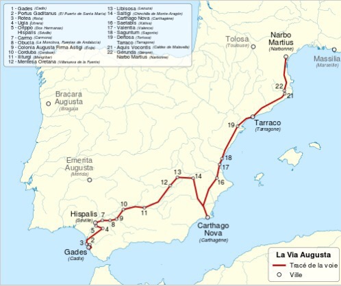 Para comunicar estas dos provincias los romanos hicieron otra de sus calzadas más importantes. Se trataba de la llamada Vía Augusta que con una longitud aproximada de 1.500 Kms discurrían desde Cádiz hasta los Pirineos bordeando el Mediterráneo y uniendo las capitales de Gades, Hispalis, Corduba y Astigi. Se trataba de una vía estratégica para los movimientos militares, el comercio y el correo.