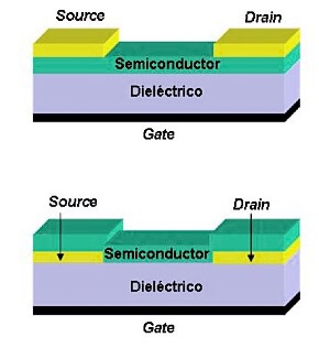 Configuraciones de un OFET: contacto superior (arriba) y contacto inferior (abajo).