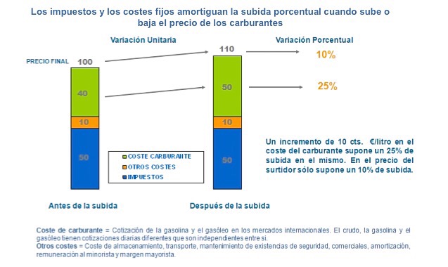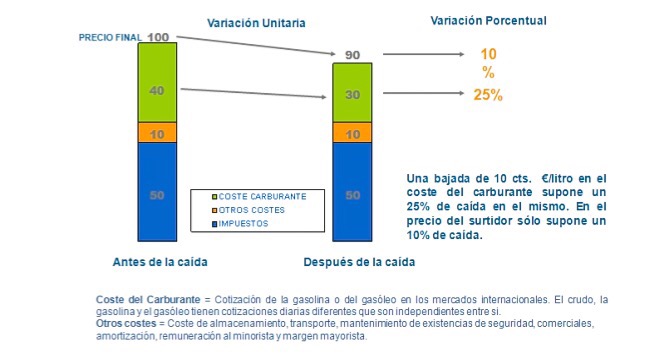 En el caso inverso, una bajada de un 10% en el coste del carburante supone un 25% de caída en el precio de la materia prima en origen (combustibles, no barril de crudo), pero el precio del litro en el surtidor cae en un 10%