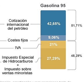 La formación del precio de la gasolina depende del coste de este carburante en los mercados al por mayor de referencia, que para España son los del Mediterráneo y los del Norte de Europa. En estos mercados los precios de este producto  varían en función de ciertos parámetros como los cierres temporales de refinerías, la estacionalidad, y la demanda por lo que el 42,65% del precio de la Gasolina Sp 95 no se debe a la cotización internacional del petróleo sino a la cotización internacional que tiene este producto. Luego tenemos que sumar otro 9,06% de costes fijos de logística y comercialización (almacenamiento, transporte, mantenimiento de reservas estratégicas, comercialización, gastos financieros, amortizaciones y remuneraciones de minoristas y mayoristas) y una partida de impuestos que representa un 48,29 % del precio final que pagamos en las estaciones de servicio.
