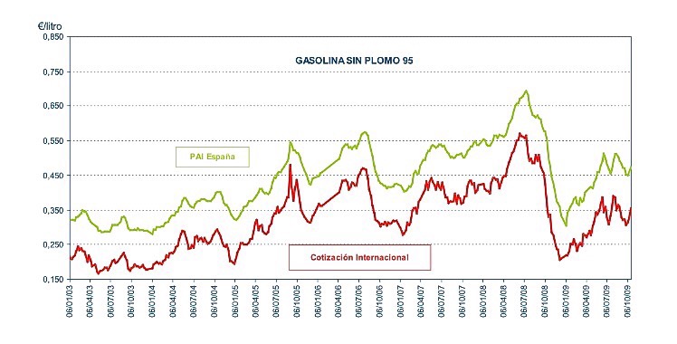 Y así es como cuando desde enero a octubre del 2009 el crudo Brent subió casi un 76% en €/litro, la gasolina en el mercado al por mayor subió aproximadamente un 66%, y el precio en el surtidor sólo lo hizo en aproximadamente un 30%. Y basta analizar las estadísticas de la evolución de precios publicadas por el Ministerio de Industria y la CNE, para ver que las curvas de los precios en el surtidor antes de impuestos y las cotizaciones internacionales reflejan variaciones prácticamente paralelas a lo largo del tiempo.