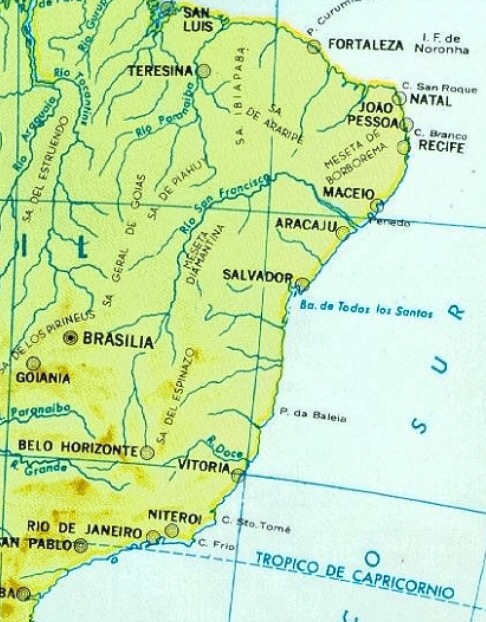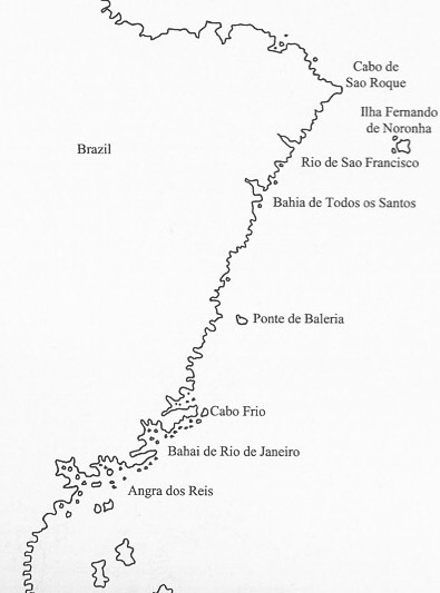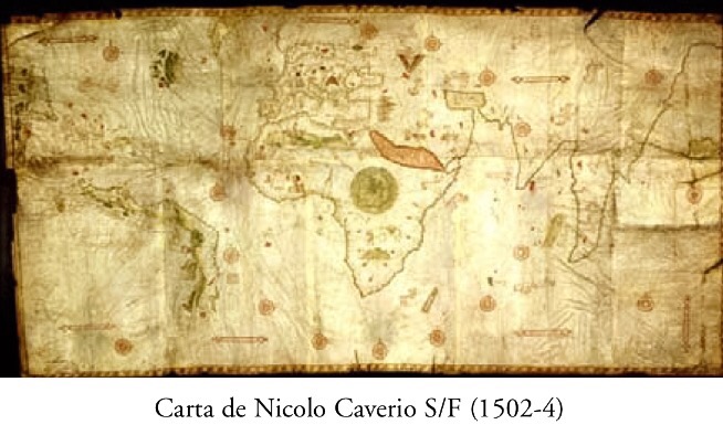 Para dibujar la costa brasileña (por cierto, de manera bastante exacta en muchos de sus detalles topográficos.) Piri Reis debió basarse, casi con toda seguridad en el famoso mapamundi de Nicolás Caverio dibujado entre 1502 y 1504, tras los viajes de Américo Vespucio en 1501 al servicio de Portugal, que reproducía los conocimientos del mundo hasta el citado año 1502