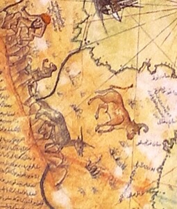 Piri Reís en su Texto IX nos afirma; «en este país parece que hay monstruos de pelo blanco, de este aspecto y también bueyes de seis ciernes. Los portugueses infieles lo anotaron en sus mapas»