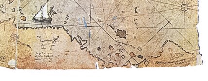 Y en el Texto XII nos cuenta algunas de sus maniobras «… hay una torre sobre esta playa … sin embargo, está … en este clima de oro … tomando una cuerda … se dice que midieron«. Por cierto que en esta zona faltan la mitad de cada una de las líneas del mapa, lo que hace suponer que el mismo fue rasgado por aquí en dos partes.