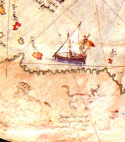 Los límite del mundo en el siglo XVI se definían por unas míticas columnas que los mapas antiguos situaban cada lado del estrecho de Gibraltar. Las mismas eran la última frontera para los antiguos navegantes y más allá solo existía el caos y las tinieblas. Tras aquellas columnas, las leyendas hablaba de monstruos horribles que habitaba en aquellas zonas incógnitas. Por eso Piri Reís se dejó llevar por aquellas fantasías, y en su mapa, nos muestra en sus Textos XXIII y XXIV la existencia en aquellas zonas de «extrañas criaturas»