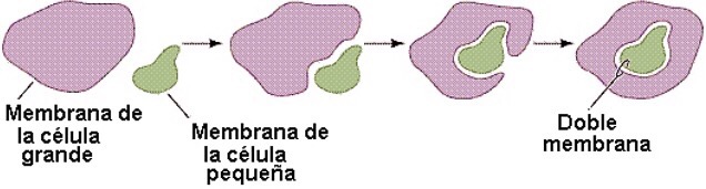 Pero luego surgieron las células «eucariotas» (del griego ‘eu‘ =bueno» y ‘karyon‘=núcleo) que desarrollaron un núcleo genuino y que marcaron el inicio de los organismos pluricelulares. Una teoría que explica la forma como las células eucariotas surgieron de sus antepasadas procariotas nos la dio en 1.980, Lynn Margulis que propuso una teoría llamada «endosimbiosis«. De acuerdo con esta idea una célula procariota grande debió de fagocitar a otra pequeña procariota hace unos 1.500 o 700 millones de años, pero lo que pasó fue que en vez de digerir al pequeño organismo, las células grande y pequeña entraron en una especie de simbiosis conocida como «mutualismo» en el cual ambas se benefician y ninguna es dañada. En la imagen siguiente se representa un esquema de cómo pudo ser aquel probable proceso de fagocitosis que dio origen a la endosimbiosis. y a la formación de una célula eucariota.