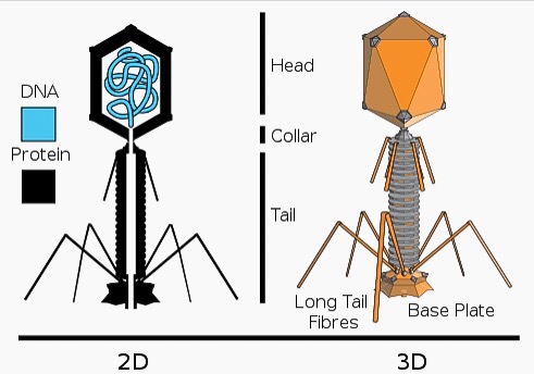 El virus Fago T4 es un ejemplo de lo que es una estructura viral. Se trata de una molécula de material genético ubicada en un medio formado de proteínas. La existencia de «material genético» en estas minúsculas entidades, los emparenta en cierto modo con lo que llamamos «seres vivos» pero la forma en que transmiten su ADN se hace de una manera bastante distinta a como lo hace un ser vivo. Un virus fuera de una célula es un objeto inanimado (cristal inerte) pero cuando alcanza una de ellas su respuesta cambia y pasa de «molécula inerte» a «molecula viviente«.
