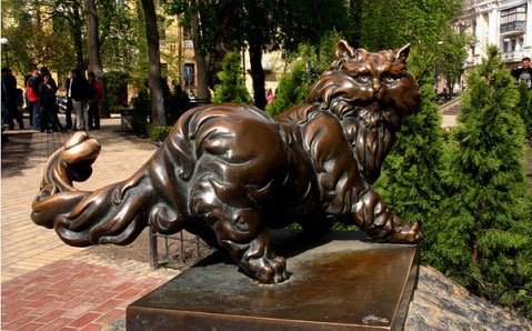 Se trata de un monumento en bronce a un gato llamado Panteleymón que se encuentra al lado de la salida de la estación ‘Zoloti Vorota’. No es nada difícil encontrarlo, ya que alrededor de él hay siempre mucha gente con ganas de hacerse una foto y pedirle un deseo frotando detrás de su oreja. La idea surgió de la existencia de un restaurante de la zona donde vivía aquel gato, mimado por los huéspedes y por los propietarios del mismo. Cuando tras un incendio en aquel local aquel gato murió por intoxicación de humo, sus amigos encargaron su monumento en bronce y lo instalaron frente al viejo restaurante para conmemorar su recuerdo.