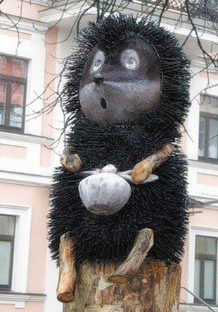 Instalado en la cruce de la Zolotovorotska, y los callejones Reitarskiy y Gueorguievskiy este monumento está dedicado al famoso protagonista de unos dibujos animados soviéticos titulados ‘El Erizo en la niebla’, un corto animado, dirigido por Yuriy Norshteyn, escrito por Sergei Grigoryevich Kozlov y producido por el estudio Soyuzmultfilm en el año 1975. El personaje está sentado en un tocón alto y tiene lío de confitura en sus patitas. La estatua está hecha en pino, y con unos mil tornillos y bastidor.