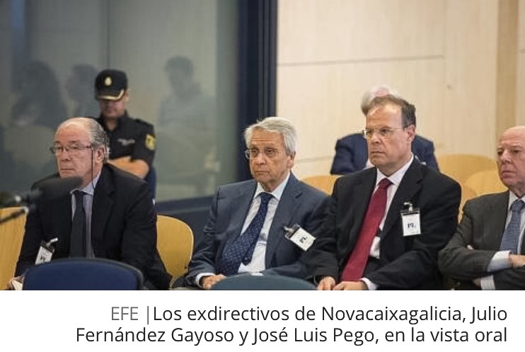 El caso Novacaixagalicia (NCG) una Caja, convertida en banco, tambien nacionalizada por el Banco de España y de la que el Estado tomó un 93% de su capital por un importe de 2.465 millones también es de traca. El FROB le inyectó 1.162 millones en participaciones preferentes y aquellos tres altos cargos de la misma quisieron repartirse unos milloncejos de euros en conceptos de despido y aportaciones de la caja a sus respectivos fondos de pensiones. Al final los condenaron y tres de ellos —Pego, Gorriarán y Rodríguez Estrada— tuvieron que devolver casi 14 millones de euros pero al ser la pena de prisión de dos años, no tuvieron que ingresar en la cárcel y -por desgracia-aquellos 14 millones parece ser que no alcanzaron el total del dinero cobrado indebidamente, que según los cálculos de Anticorrupción se cifraba en unos 18,9 millones de euros.