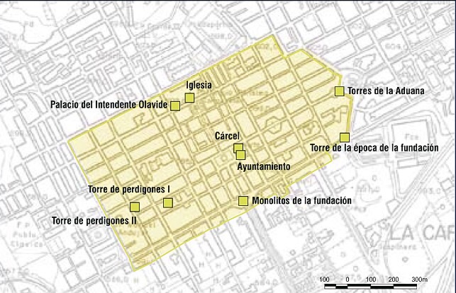 La huella urbanística de aquel proyecto ha quedado reflejada en el trazado ortogonal de las calles de La Carolina que reflejan como aquellas ciudades y pueblos de las Nuevas Poblaciones tenían una marcada impronta colonial y que a partir de los ejes camineros se organizaba una trama reticular, adaptada a diversas soluciones formales en cuanto a la disposición de las parcelas y la posición de las plazas como elementos centrales del espacio urbano. Esta tipología de ciudad, posteriormente sirvió de modelo para el urbanismo americano