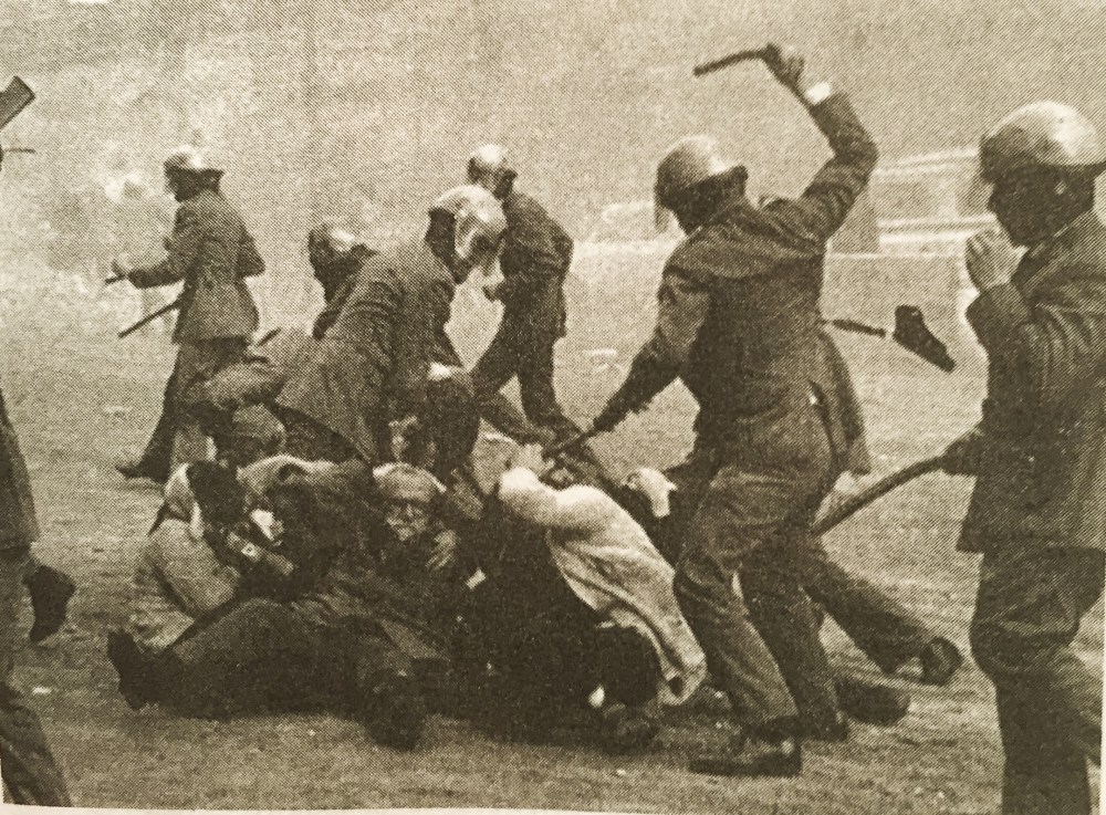 Aquellos «grises» siempre se caracterizaron por «dar leña» (no por recibirla). Esta famosa foto fue tomada el 1 de Febrero de 1976 (recién muerto Franco) por el reportero Manuel Armengol y nos muestra a unos policías «arreando estopa» a un grupo de manifestantes en Barcelona que aquel día y a a pesar de la prohibición gubernativa- salieron a reclamar sus derechos bajo el grito de «Libertad, amnistía y Estatut de autonomía«. Fueron solo 50 los catalanistas que salieron aquel día y se sentaron en el centro del paseo de San Juan, a la altura de la calle Provenza y aquellos policías recibieron órdenes de disolver aquella manifestación. Al no moverse los sentados les arrojaron botes de humo y como no hubo resultado, el siguiente paso fue la «orden de cargar con porras«. La foto nos muestra como pegar a tres de aquellos manifestantes: Lluís María Xirinacs, Fabián García y Rafael Pradas.