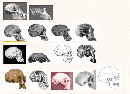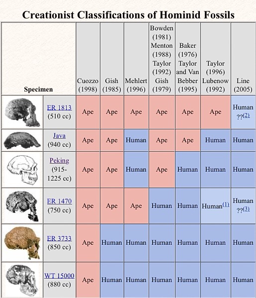 En la imagen anterior los cráneos de la fila superior son de ‘simios modernos‘, los de la 2ª fila los fósiles que casi todos los creacionistas consideraban como ‘simios puros‘, los de la 3ª fila los que los creacionistas no se ponían de acuerdo sobre si eran ‘simios‘ o ‘seres humanos‘ y finalmente los de la fila inferior son los que podían considerarse como ‘seres humanos‘. La tabla siguiente lo resume