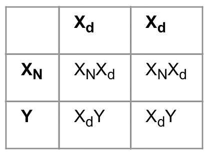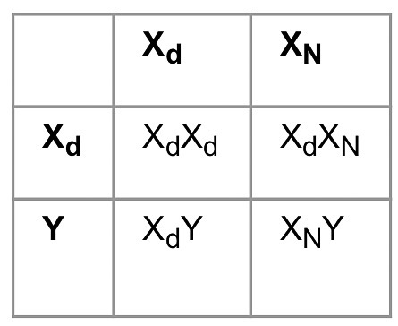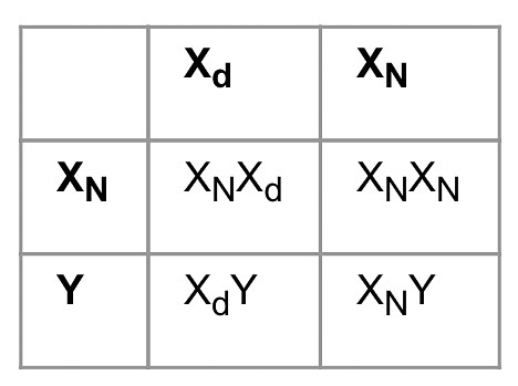 Veamos cómo se forman las combinaciones. El alelo dominante se designa con mayúscula y el recesivo con minúscula. Si caracterizamos con una letra N mayúscula (normal) la condición del cromosoma que lleva el el gen dominante (que caracteriza la visión normal sin daltonismo ), y con una d minúscula la tenencia del cromosoma con el gen recesivo del daltonismo, las posibles combinaciones que se pueden dar son:
