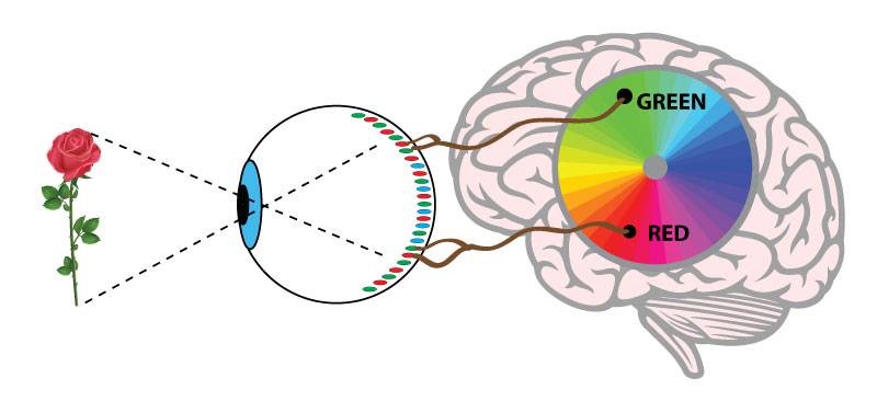Y gracias a que los objetos nos devuelven la luz que no absorben, nuestro campo visual interpreta estas radiaciones electromagnéticas devueltas por los mismos como «su color«. La energía de la luz es transformada en energía eléctrica y enviada al cerebro y la percepción del color se debe a unas células situadas en nuestra retina ocular llamada «conos«. Hay 6 millones de conos en la retina de un ojo humano con tres tipos de fotorreceptores que le permiten discernir una amplia gama de tonalidades cromáticas