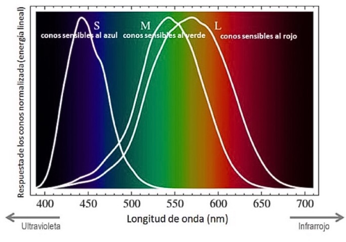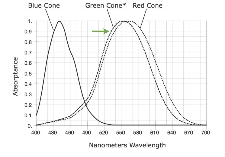 Para entender la ceguera a los colores hay que entender cómo funcionan los conos asociados a los receptores. Los rojos, y los verdes presentan una clara separación en las detecciones de las regiones de color amarillo verdoso del espectro tal y como se aprecia en la figura siguiente que muestra la respuesta normalizada de los conos de un ojo normal a la energía incidente